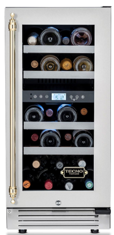 Adega Tecno Vintage 38 cm, de piso e de embutir, p/ 23 garrafas, abertura p/ direita, 2 zonas de temp., puxador em latão polido, 220V - Casa de Lila