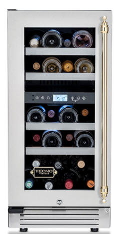 Adega Tecno Vintage 38 cm, de piso e de embutir, p/ 23 garrafas, abertura p/ esquerda, 2 zonas de temp., puxador em latão polido, 220V - Casa de Lila